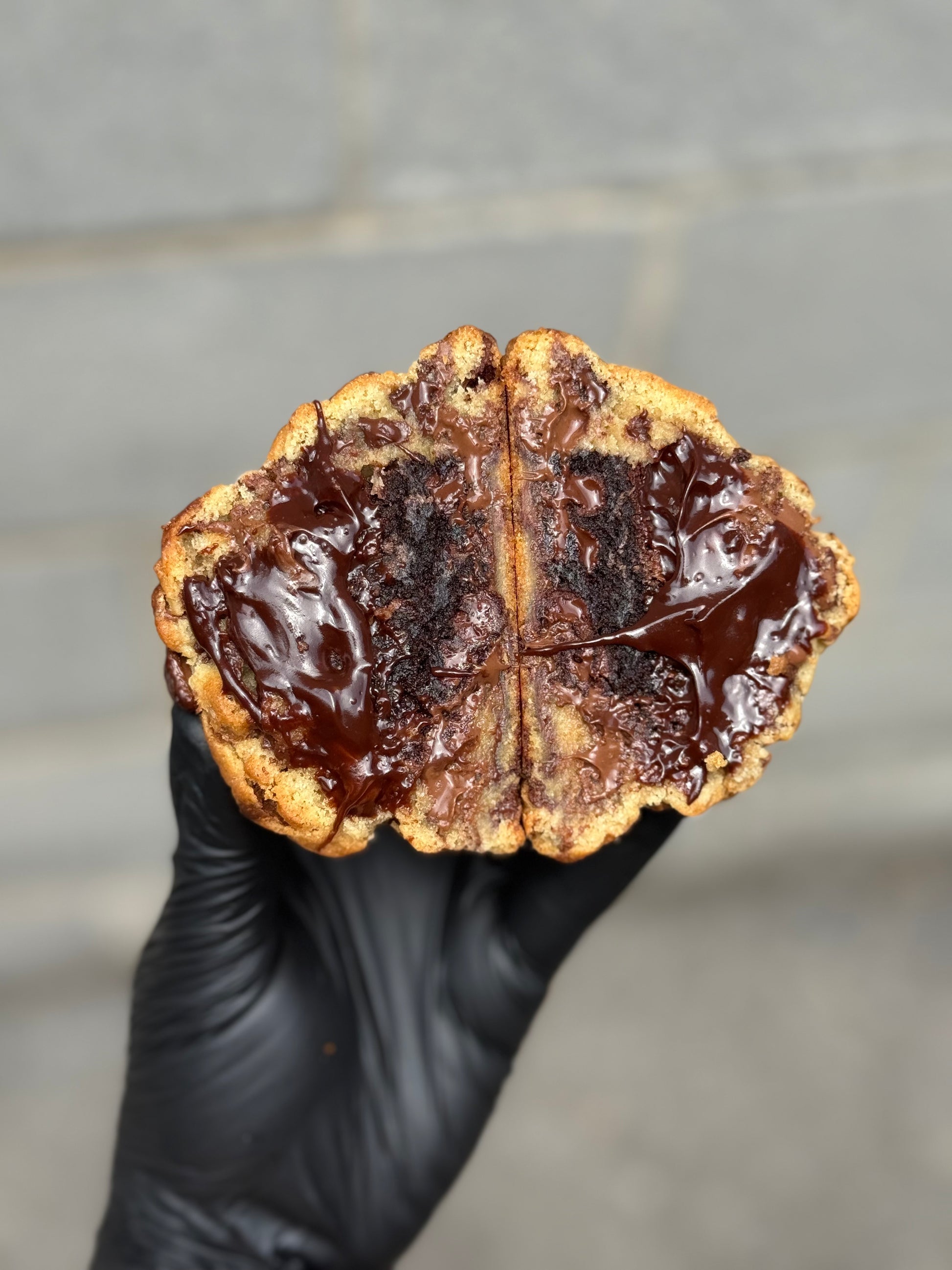 Chocolate chip ookie with semi-sweet and milk chocolate chips filled with fudgy brownie and chocolate fudge.